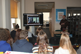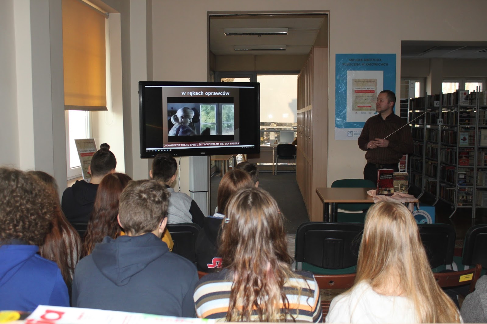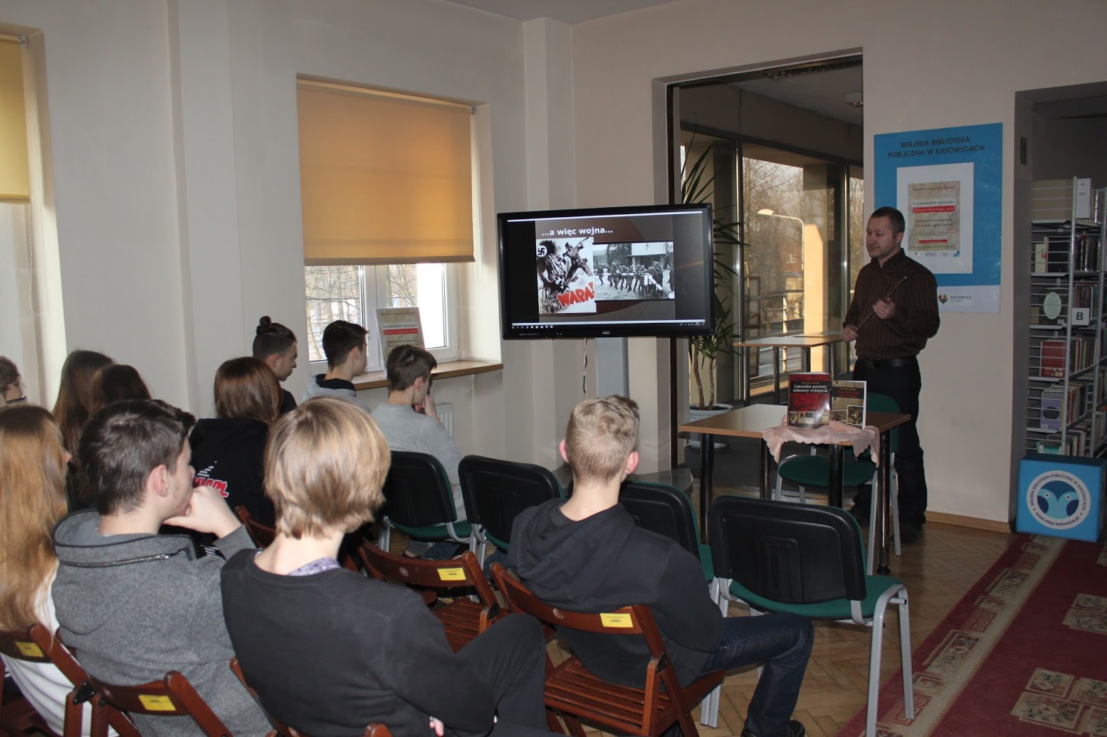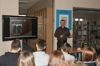 Dzisiaj gościliśmy pana Mariusza Soleckiego, polonistę, nauczyciela języka polskiego, autora książek m.in. Literackie portrety żołnierzy wyklętych oraz Historie pisane przez wojnę. W związku z wczorajszym Dniem Pamięci Żołnierzy Wyklętych przybyła do biblioteki młodzież gimnazjalna na prelekcję pt. Dziewczyna Wyklęta - Danusia Siedzikówna "Inka". Pan Mariusz przybliżył nam postać "Inki", sanitariuszki i łączniczki żołnierzy wyklętych.
